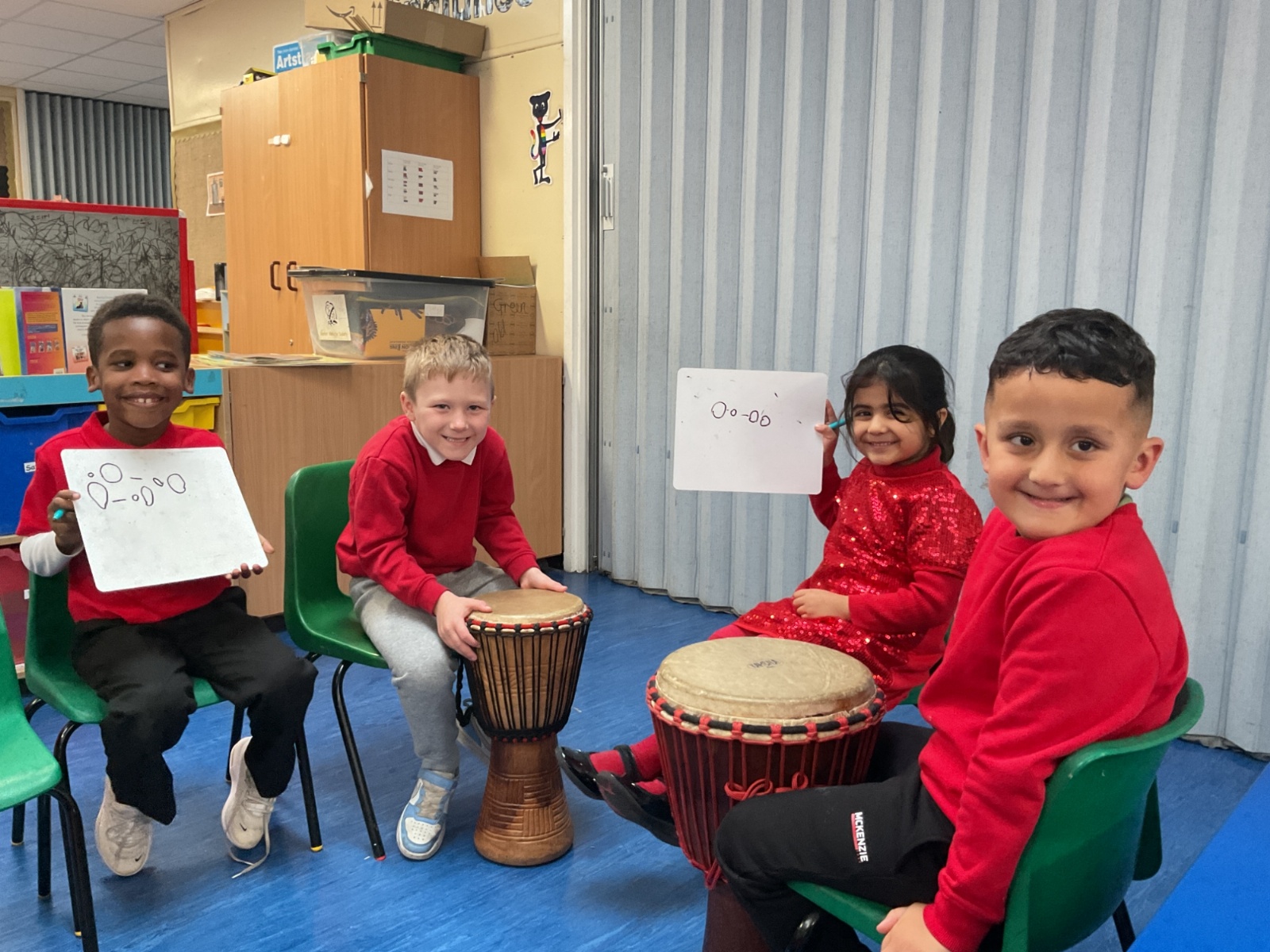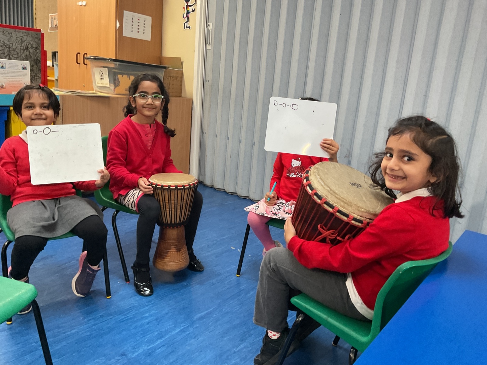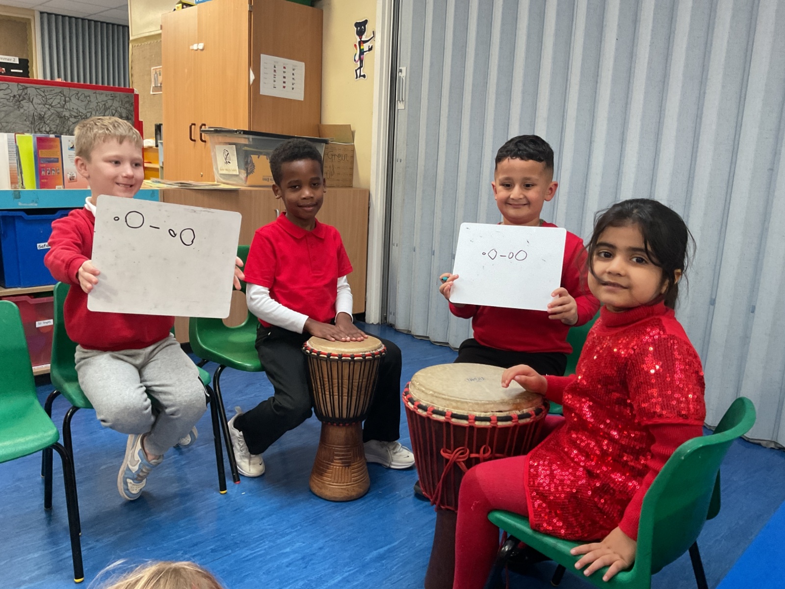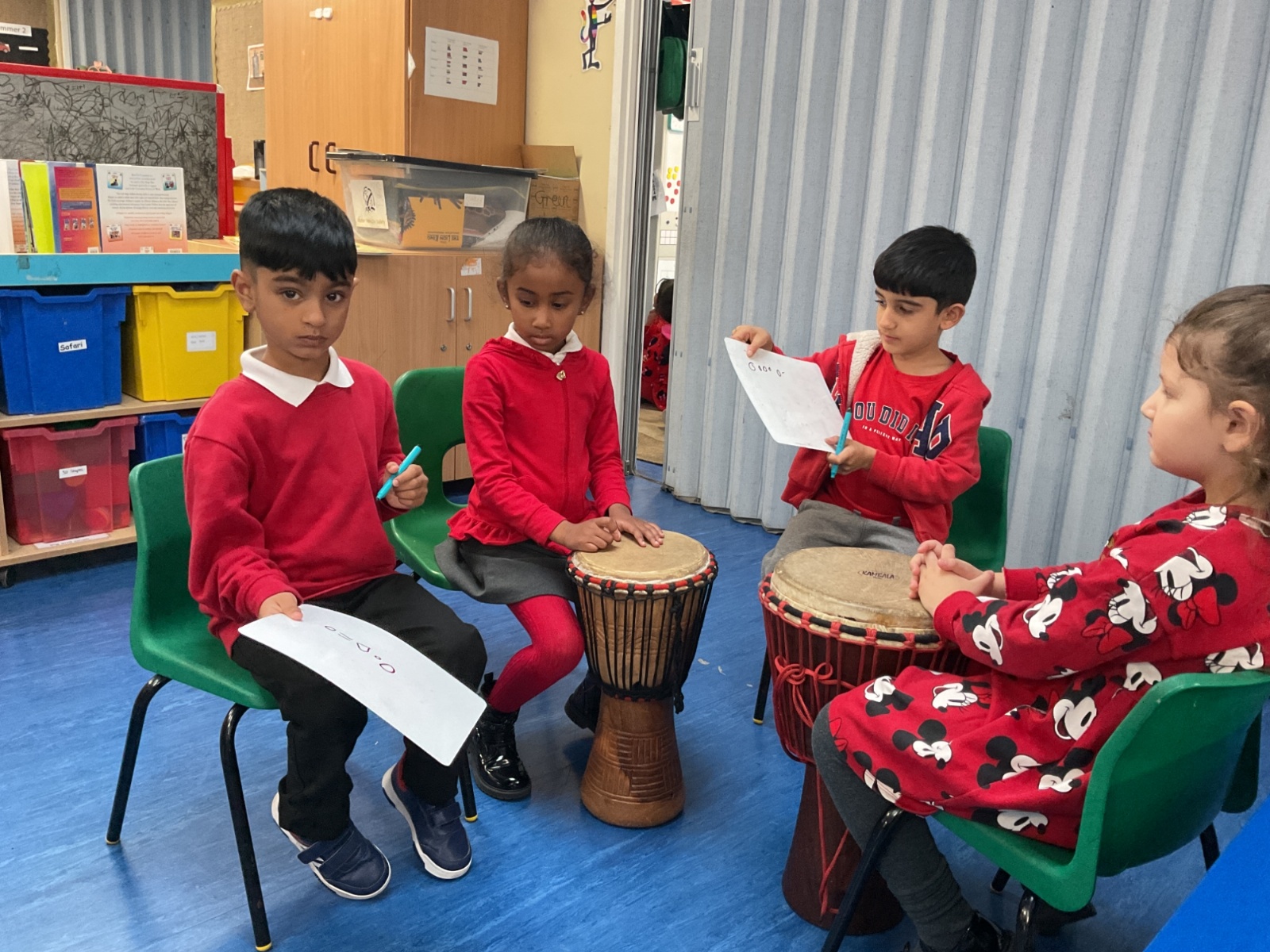 This half-term children were learning about beat in music and they were learning to drum to a specific beat.