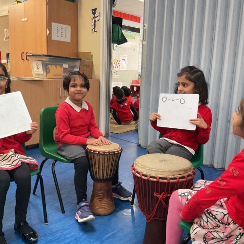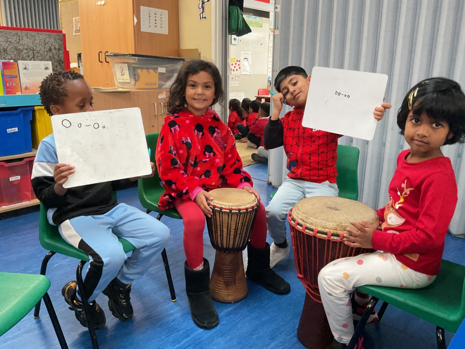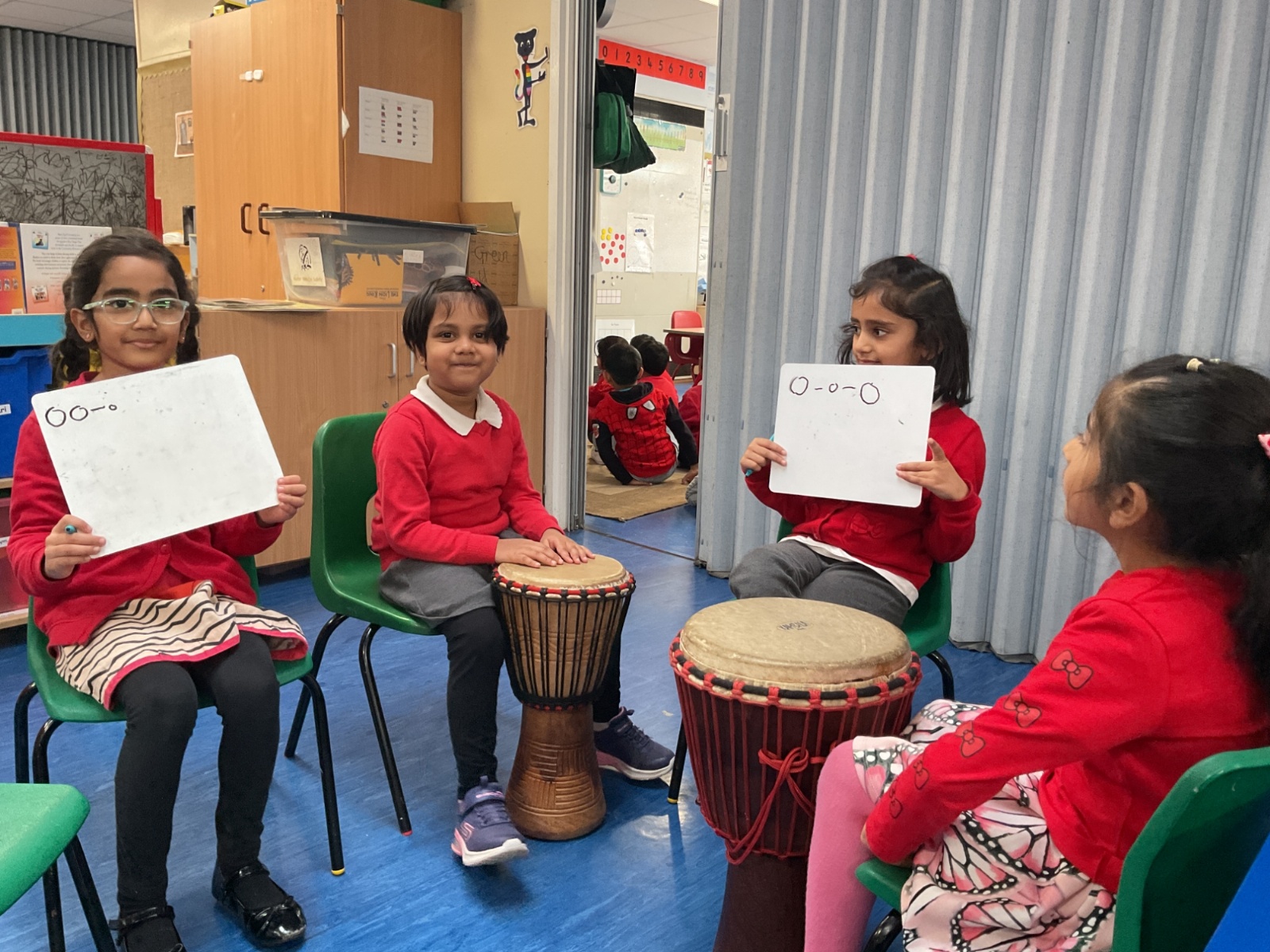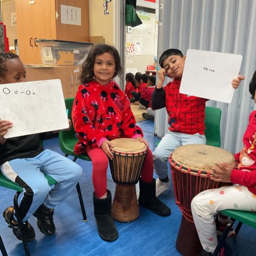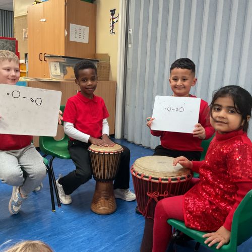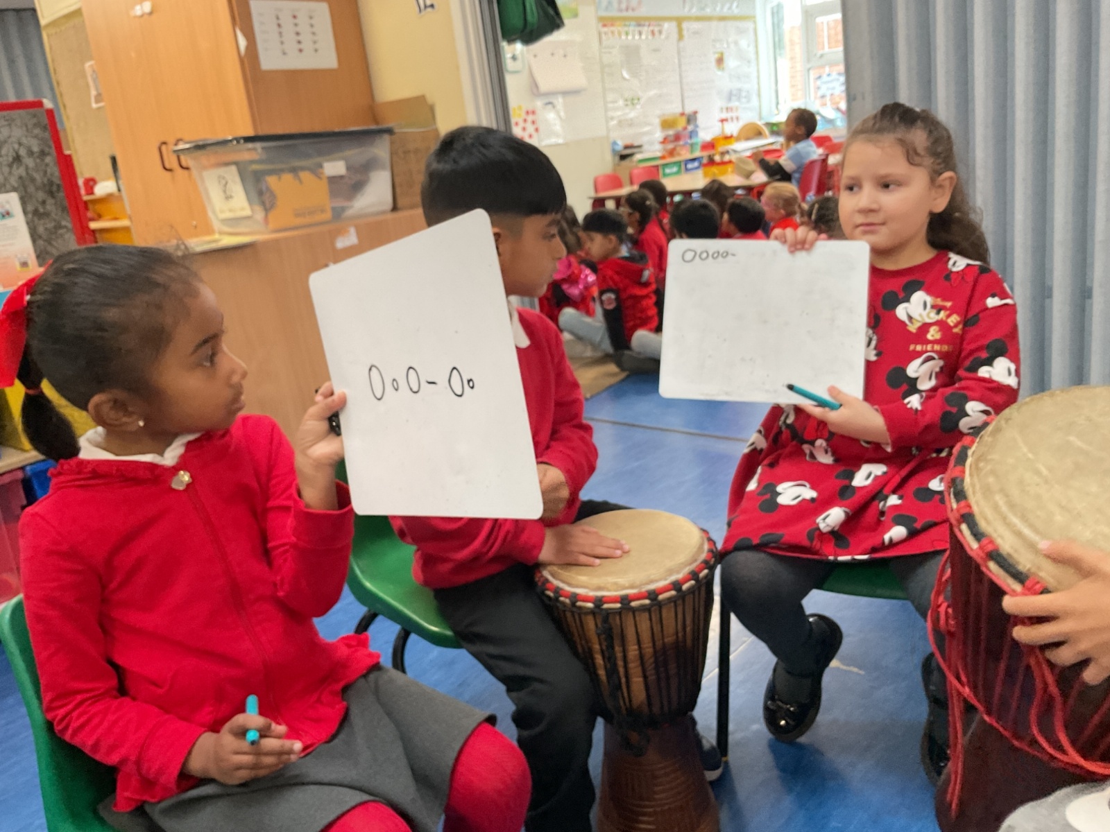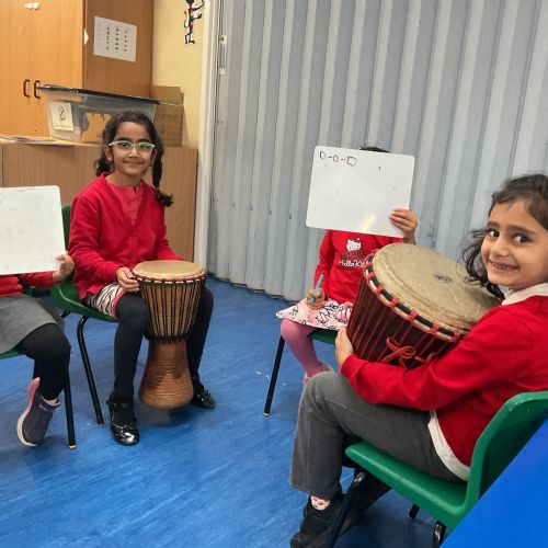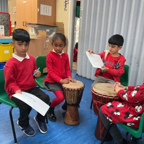 This half-term children were learning about beat in music and they were learning to drum to a specific beat.