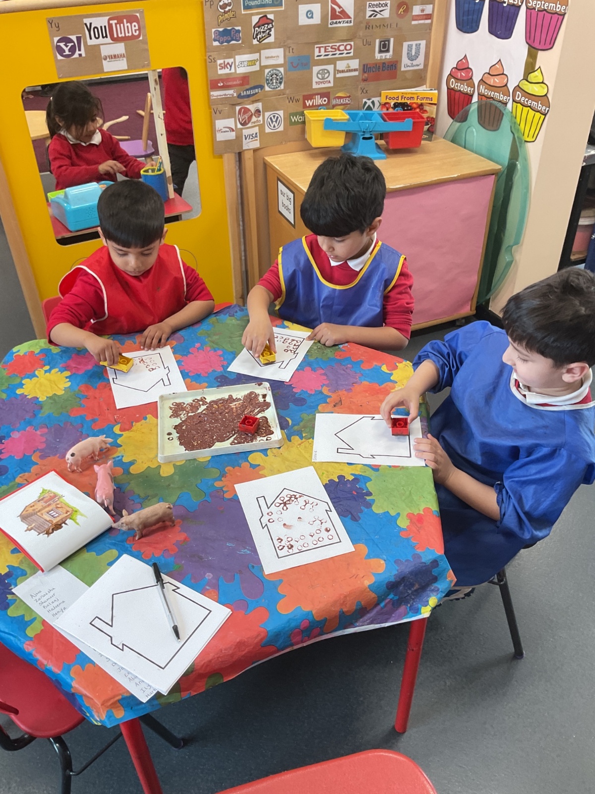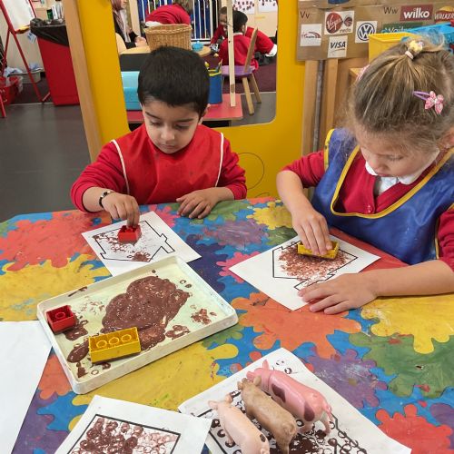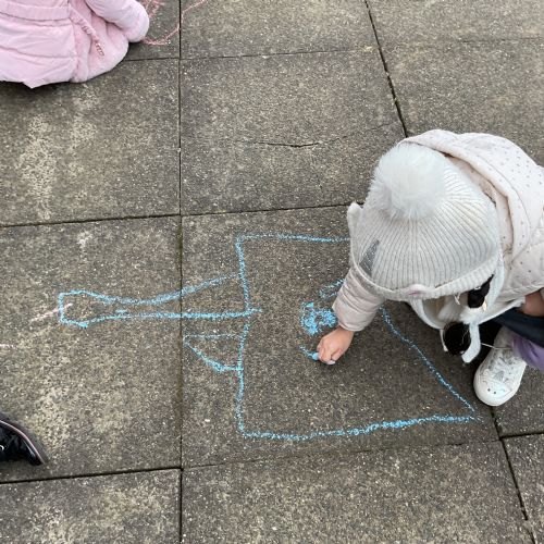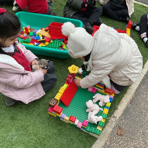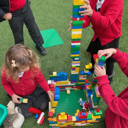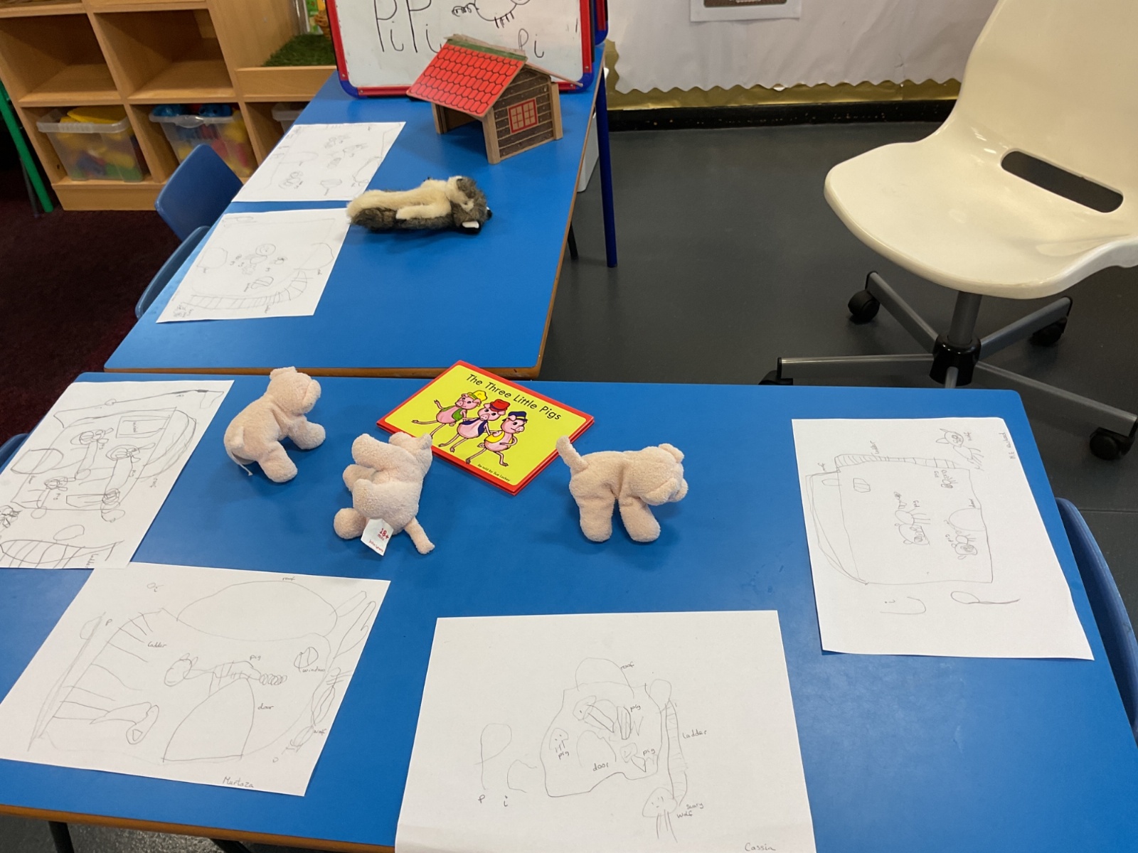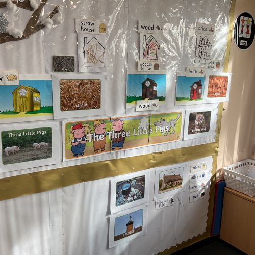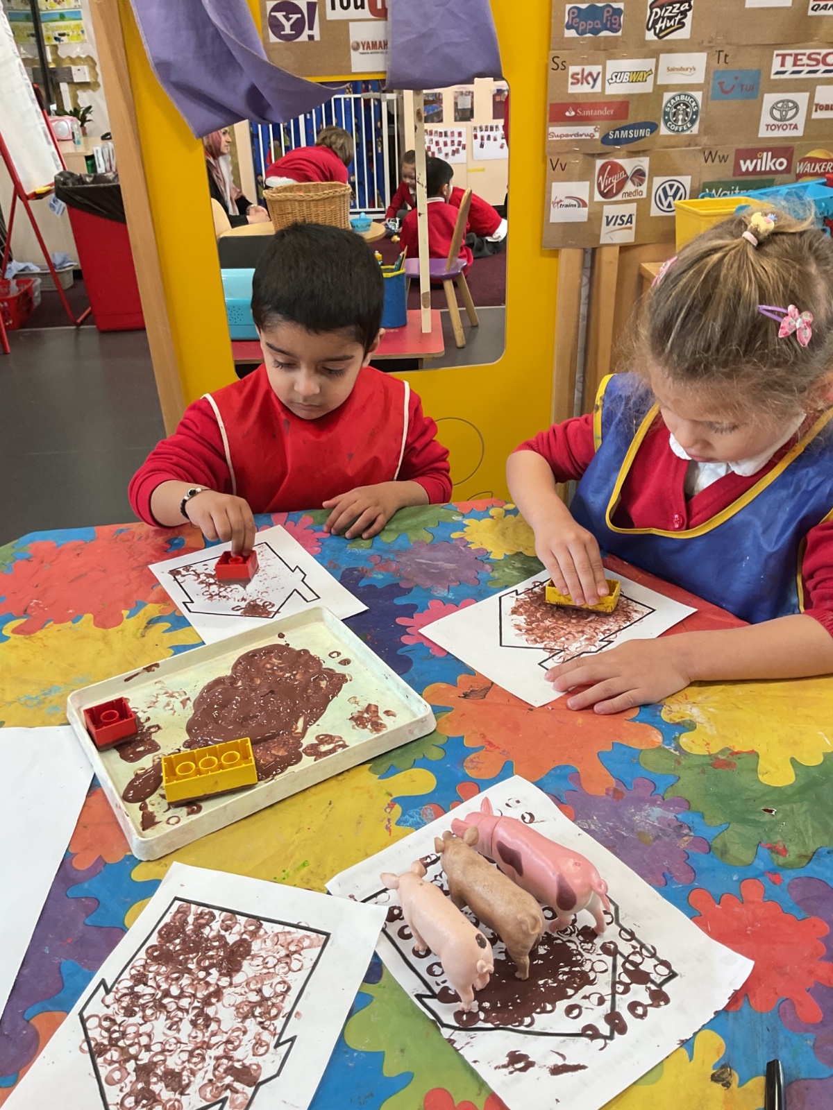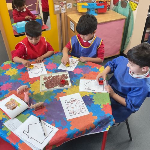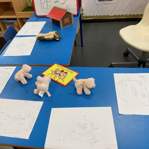 Children had fun retelling the story, 'The Three Little Pigs'. They enjoyed drawing houses in the playground using chalk. They worked together to build strong houses for the little pigs. They used Lego to build the walls and chimney.