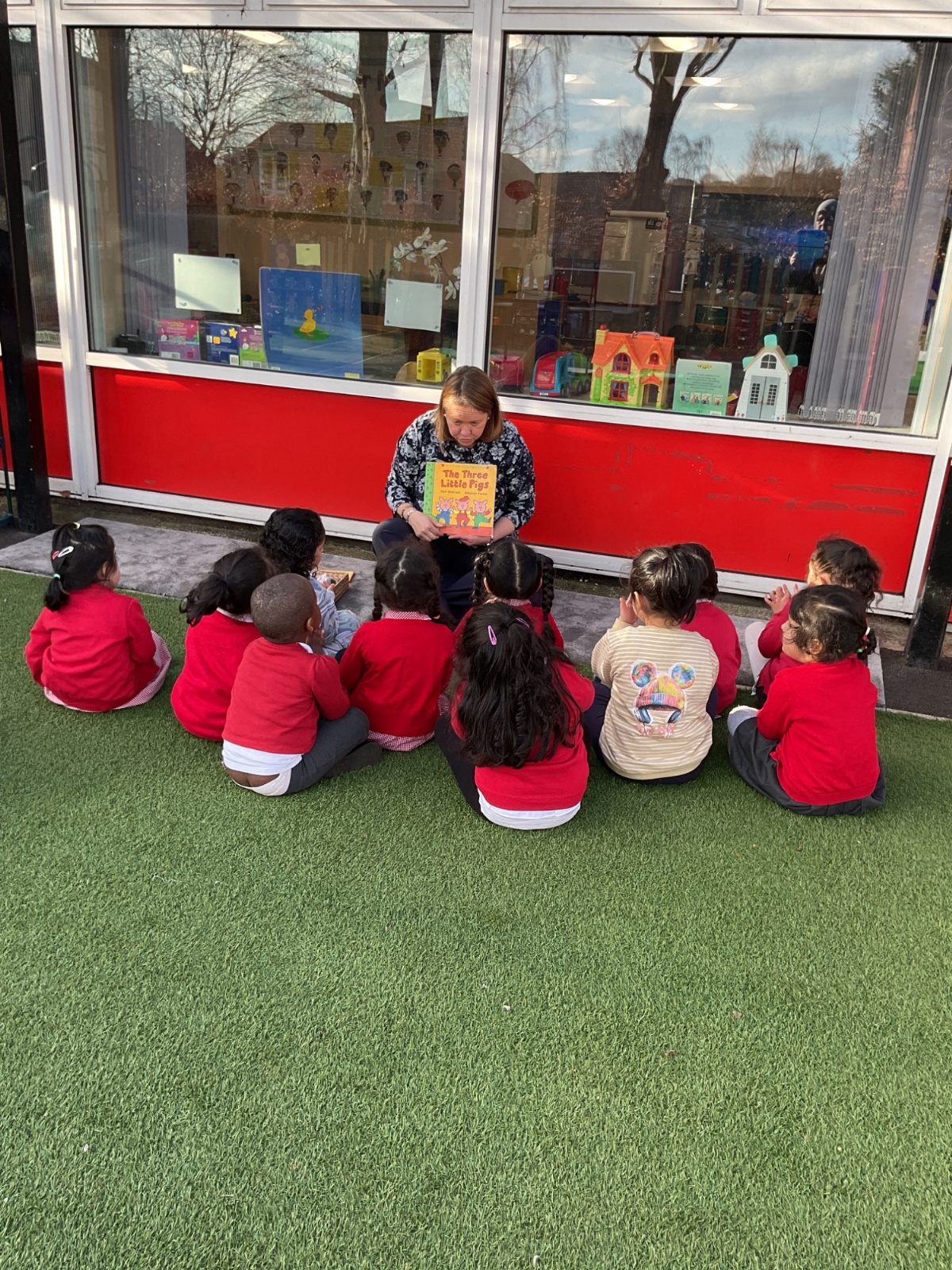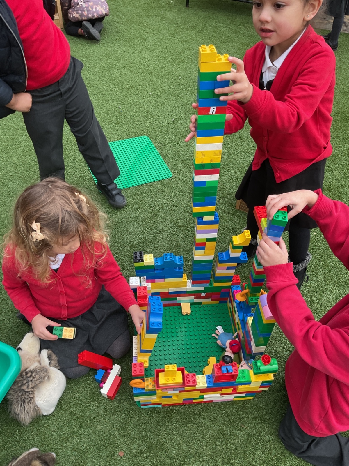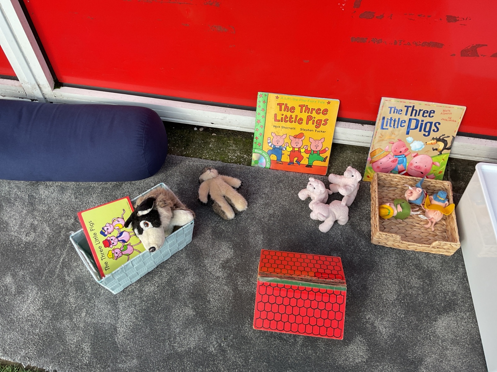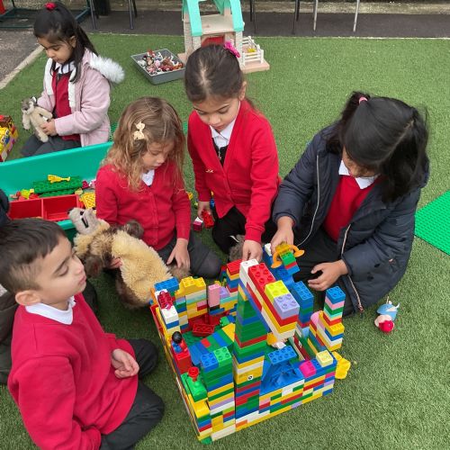 Children had fun retelling the story, 'The Three Little Pigs'. They enjoyed drawing houses in the playground using chalk. They worked together to build strong houses for the little pigs. They used Lego to build the walls and chimney.